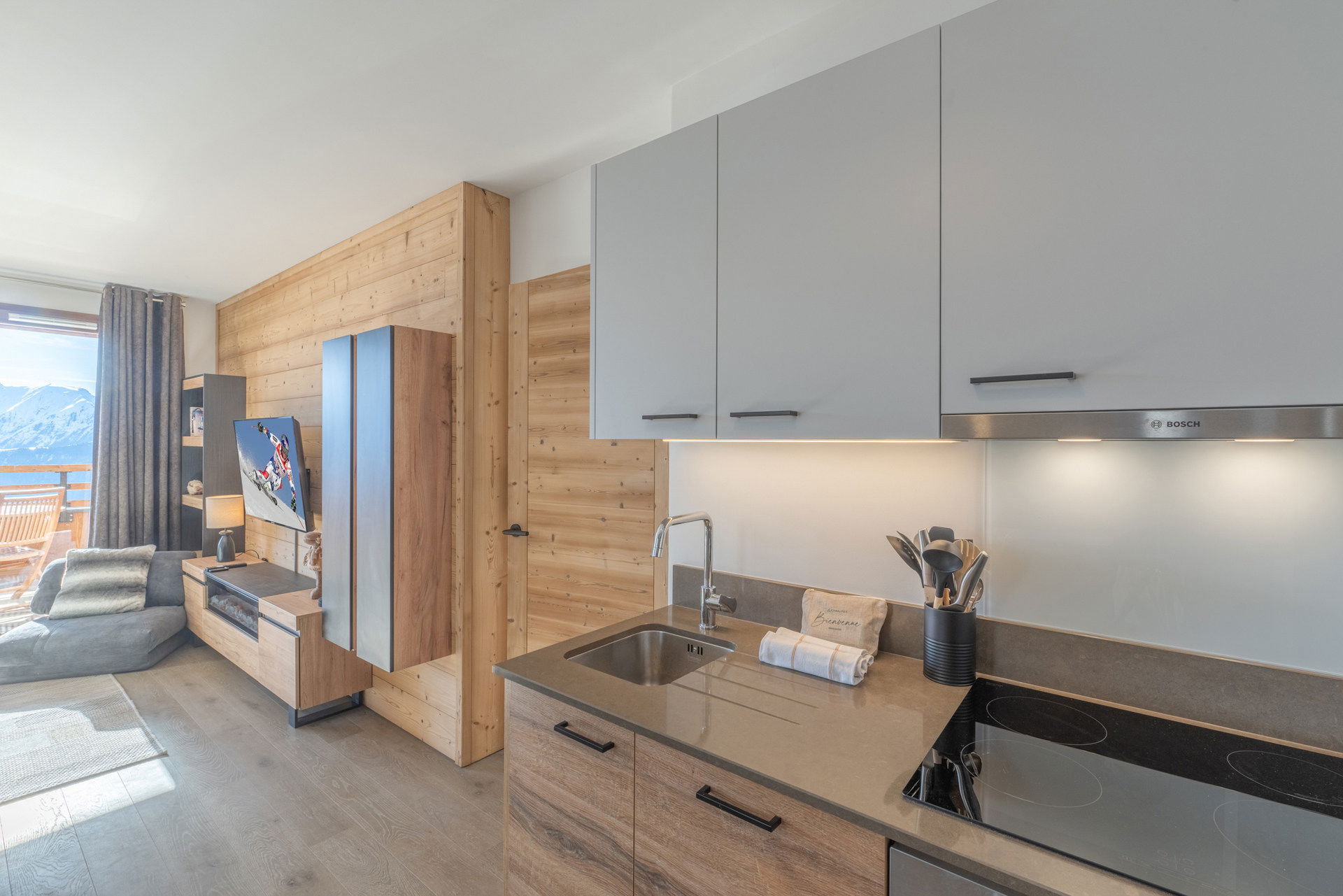 Located in the heart of Vieil Alpe, just 400m from the resort center, discover the exceptional Fermes de l'Alpe residence and this beautiful 43m² apartment for 2 adults and 2 children. Close to the ski slopes and all amenities to make the most of the resort.