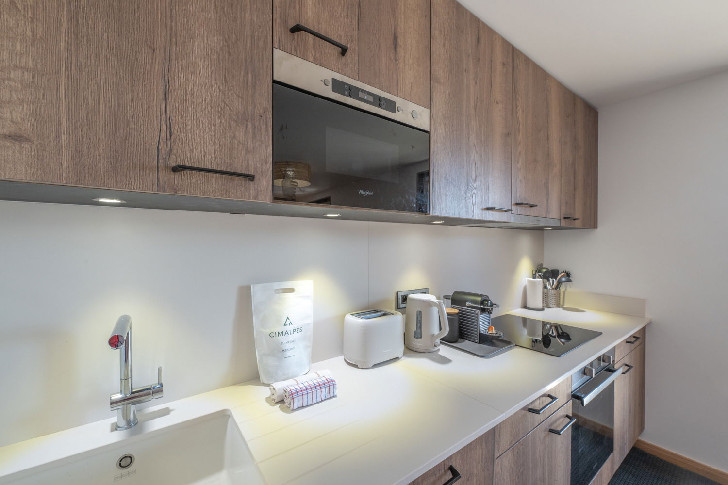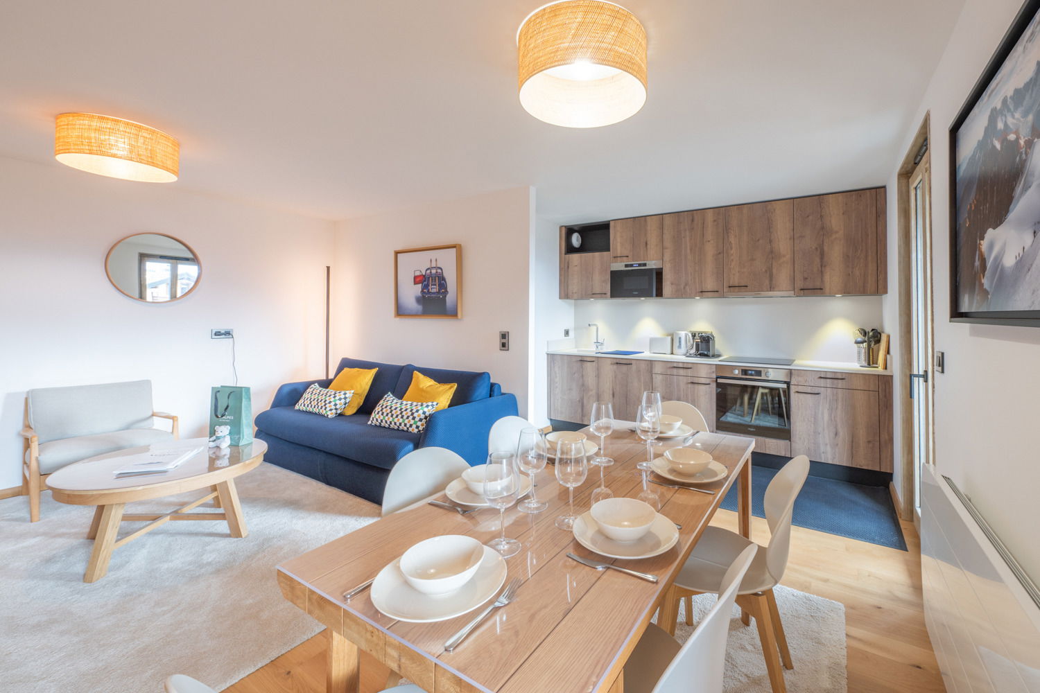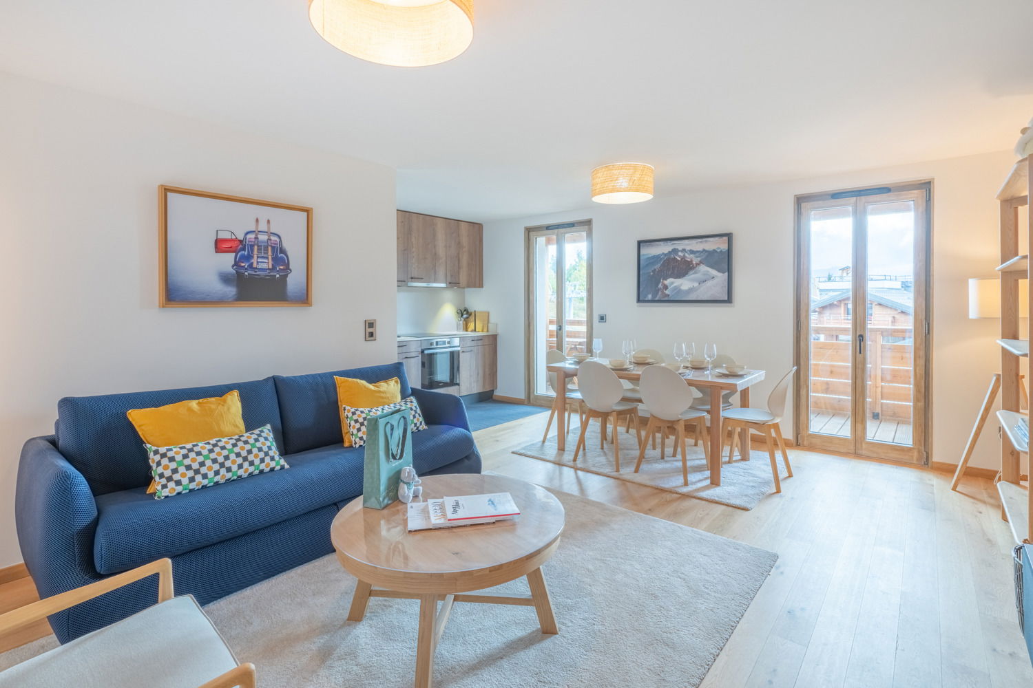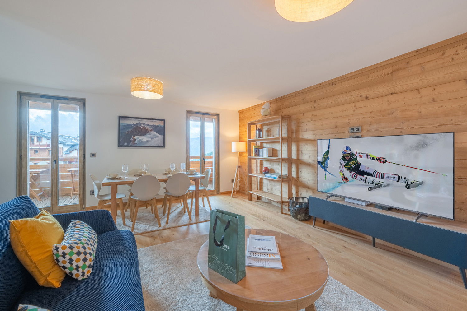 The Quartz residence, located in the heart of the historic Vieil Alpe district of Alpe d'Huez, offers an exceptional setting for winter sports enthusiasts. Ideally located, it allows ski-in ski-out access directly to the residence and is right opposite the ski lifts, guaranteeing quick access to the slopes. The south-facing apartment offers a warm atmosphere thanks to its natural wood decor and light-filled rooms for 4 adults.