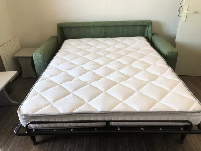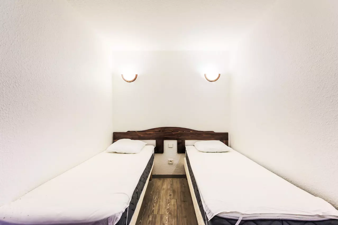 Living room composition: 1 sofa bed (sleeps 2). 1 cabin area (without door, in the entrance): 2 single beds. Dining area: 1 table with 4 chairs.